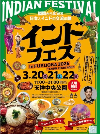イベント開催日 2026年3月20日(金祝)〜3月22日(日) インドフェスin福岡が天神中央公園で開催 福岡市中央区の天神中央公園で3月20日(金祝)から22日までの3日間、インドフェスin福岡が開催されます。 この投稿をInstagramで見る インドフェスin福岡2026(@i... -