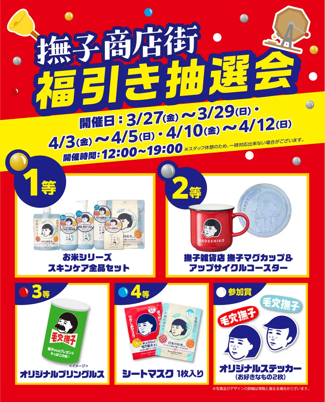 週末には、豪華景品が当たるハズレなしの福引き抽選会や自分の写真を撮影してブランドキャラクターの撫子ちゃん風の似顔絵シールが作れる「なりきり撫子ちゃんMaker」が実施されます。