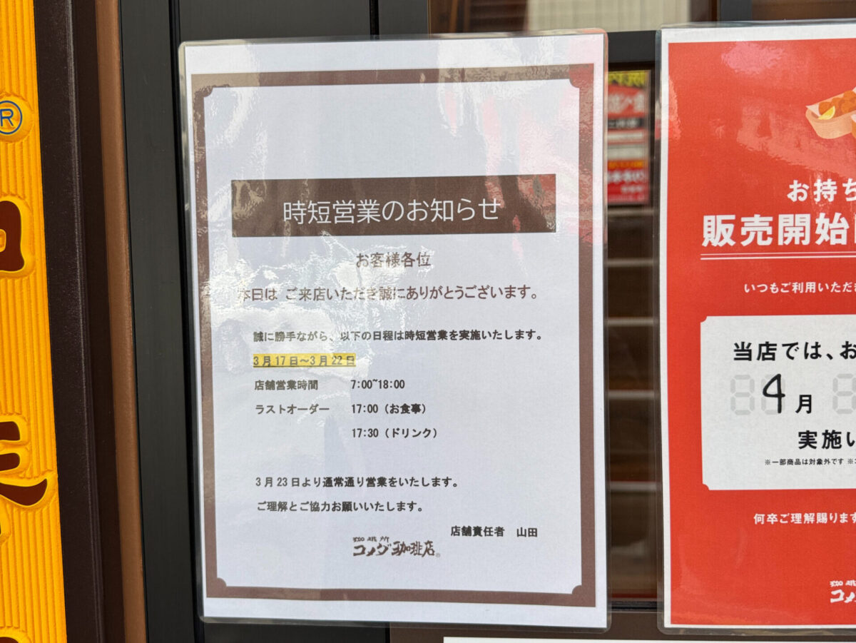 通常の営業時間は7時から23時ですが、3月22日(日)までは下記の通り時短営業となります。またお持ち帰りの商品は、4月1日(水)から開始予定です。