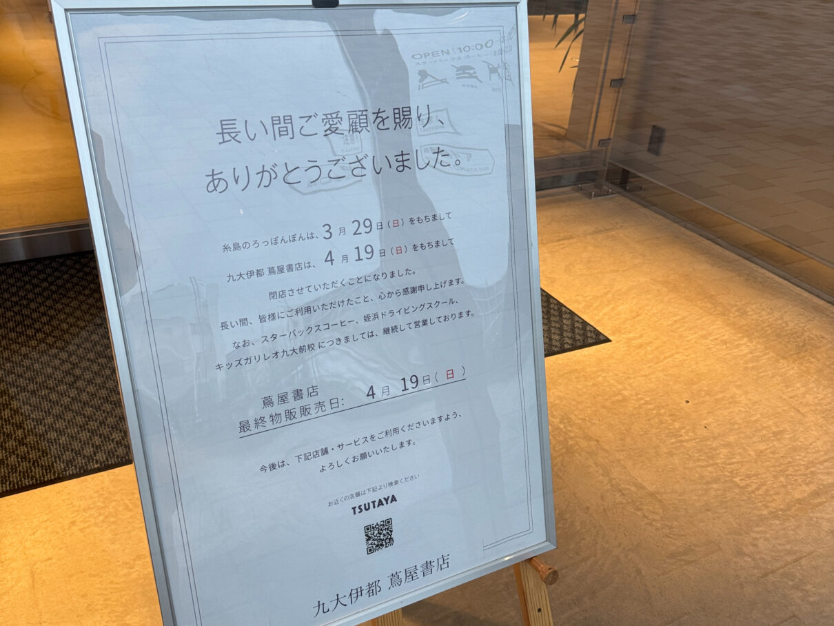 オープンから3年での閉店となります。ちなみに和白蔦屋も2026年5月17日(日)に閉店することが決まっています。