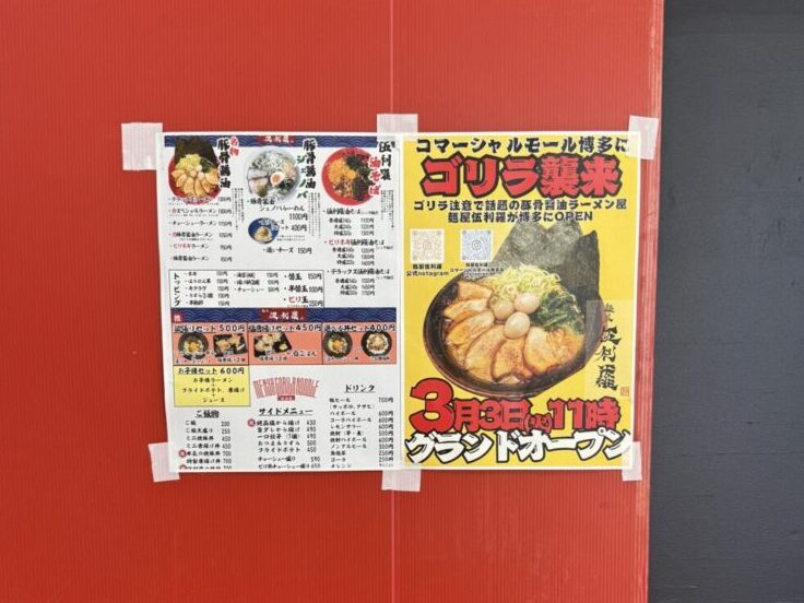 福岡市博多区東光寺町にある「コマーシャルモール博多」の1階に「麺屋 伍利羅ごりら」が3月3日(火)11時にオープンします。