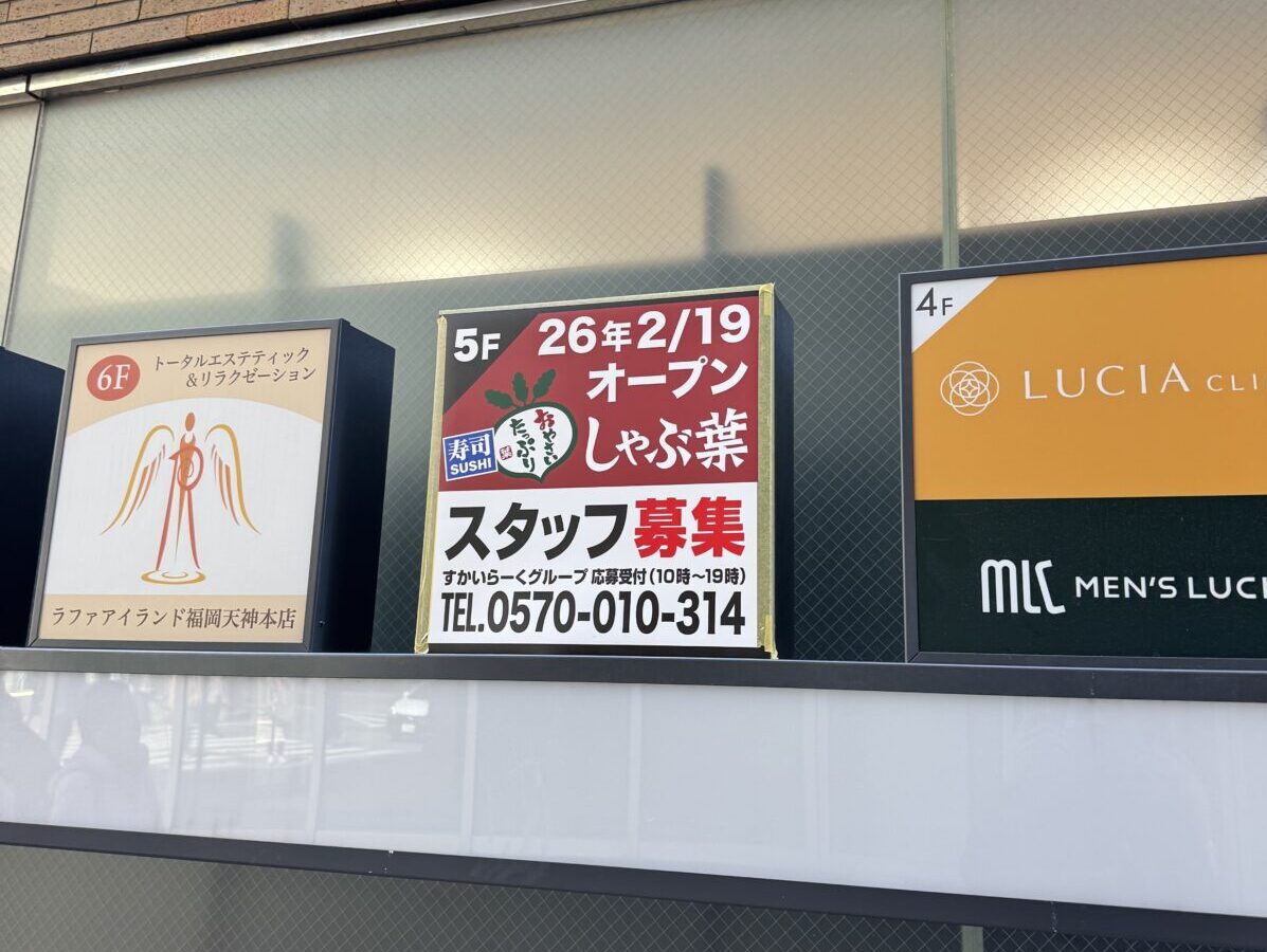 地下鉄天神駅から徒歩2分のところに「しゃぶ葉天神西通り店」がオープンしました。1階にドラッグイレブンがある天神西通りセンタービルの5階です。