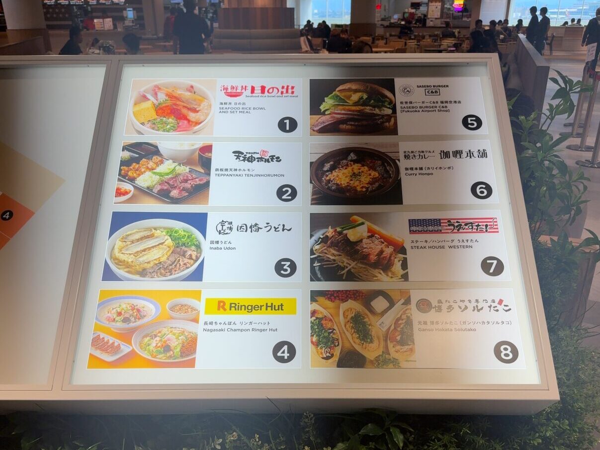 滑走路が見えるフードコートで、海鮮丼日の出やリンガーハットなど人気のお店が8店舗入っています。営業時間は8時から21時。